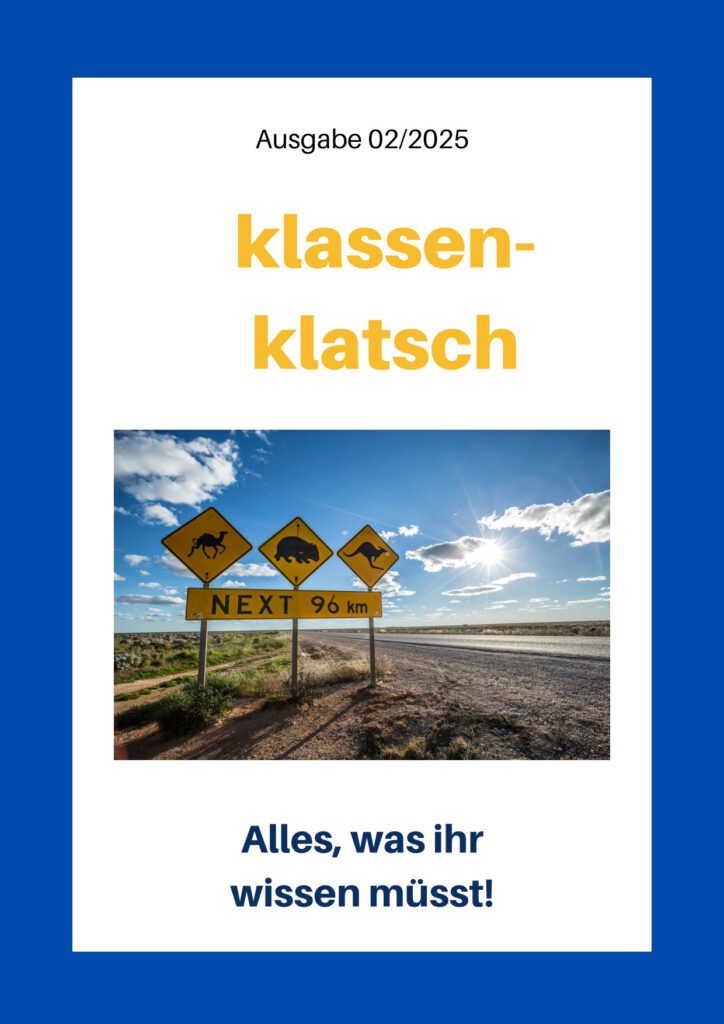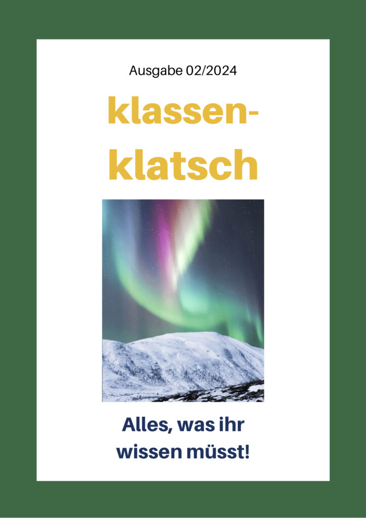- klassen-klatsch: Ausgabe 01/2025Die erste Ausgabe nach unserem Preis beim Schülerzeitungswettbewerb lädt zur Weltreise und zum Staunen ein! Viel Spaß beim Entdecken, Eure Schülerzeitungs-AG! – Bestellmöglichkeit im handlichen Schmökerformat unter Aktuelles –